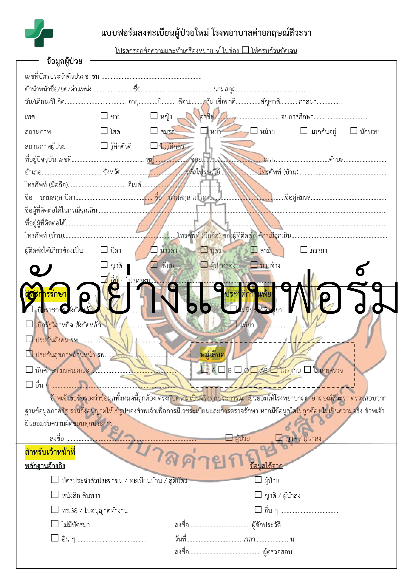 รูปแบบฟอร์มการลงทะเบียนผู้ป่วยใหม่ โรงพยาบาลค่ายกฤษณ์สีวะรา