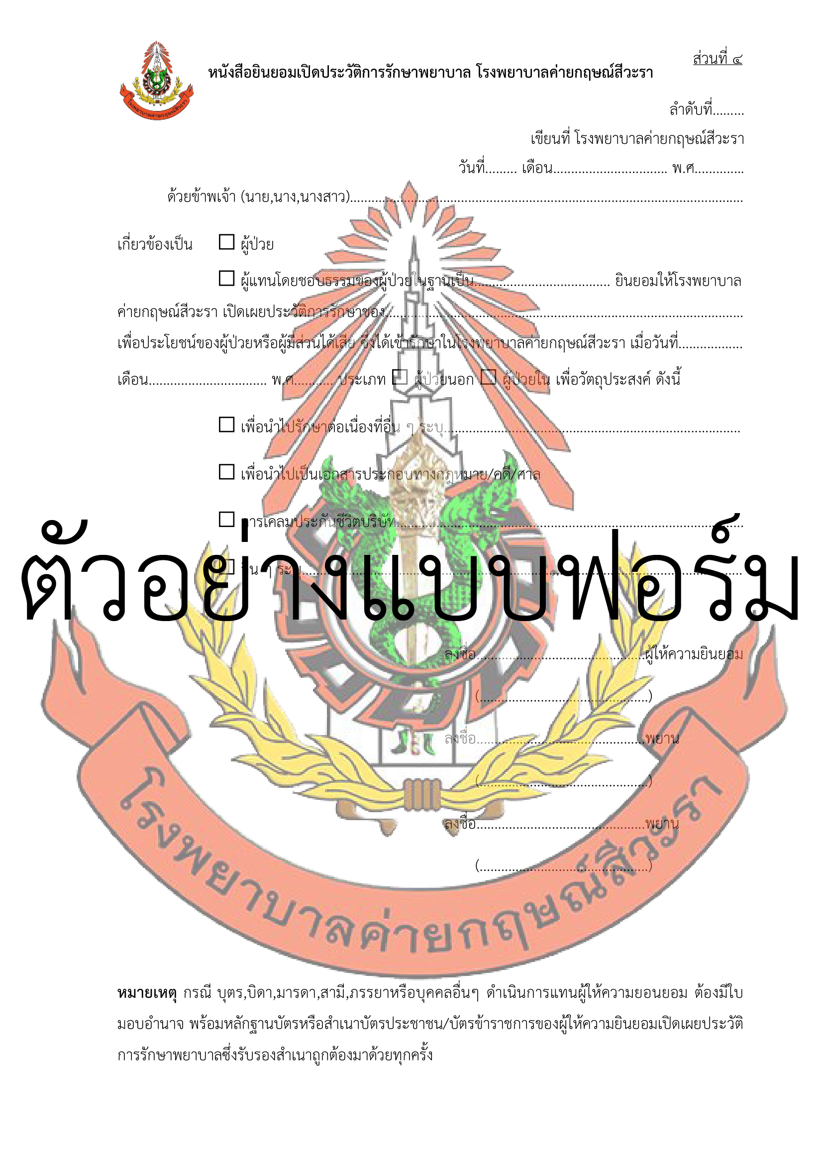 รูปแบบฟอร์มหนังสือยินยอมเปิดประวัติการรักษาพยาบาล โรงพยาบาลค่ายกฤษณ์สีวะรา